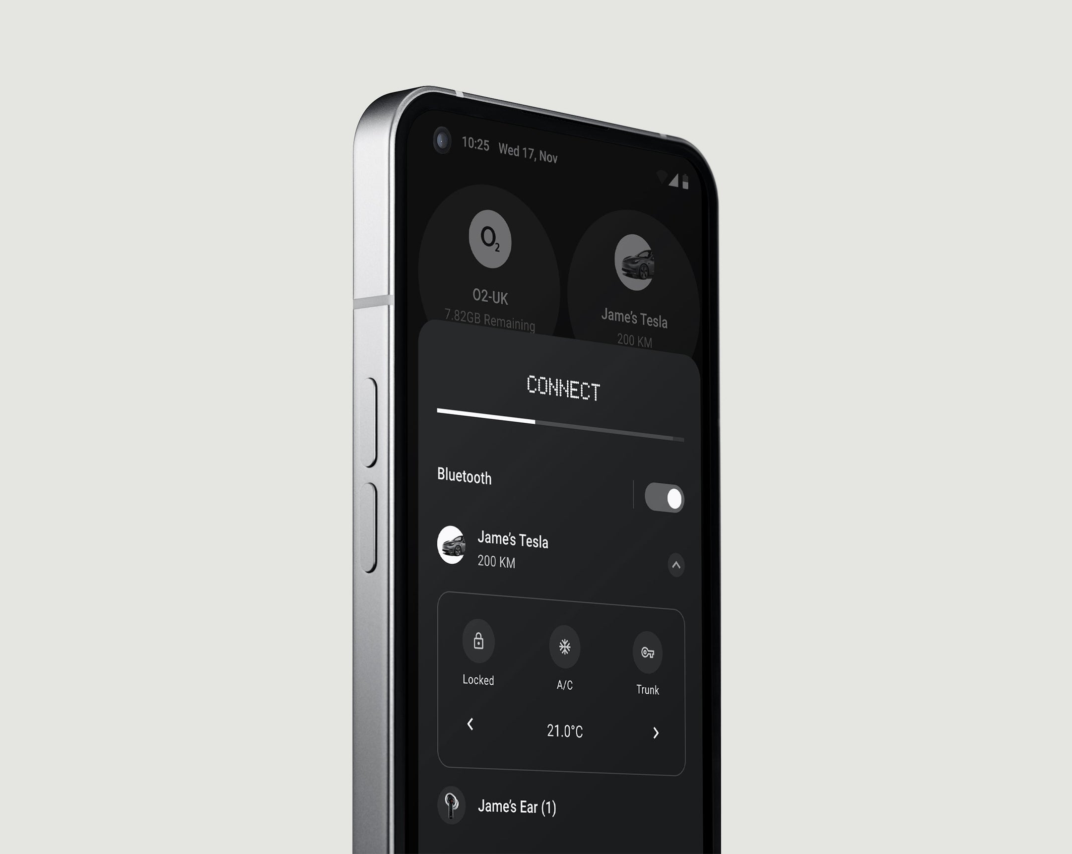 Nothing のエコシステムはすべてに対してオープンです。「クイック設定」ではサードパーティ製品を Nothing 製品と同じように簡単に管理できます。たとえば Tesla なら、ドアのロック解除、エアコンの切り替え、走行可能距離の確認ができます。AirPodsのバッテリーの残量を表示できます。個別のアプリは不要です。一つのホームからすべてを操作できます。